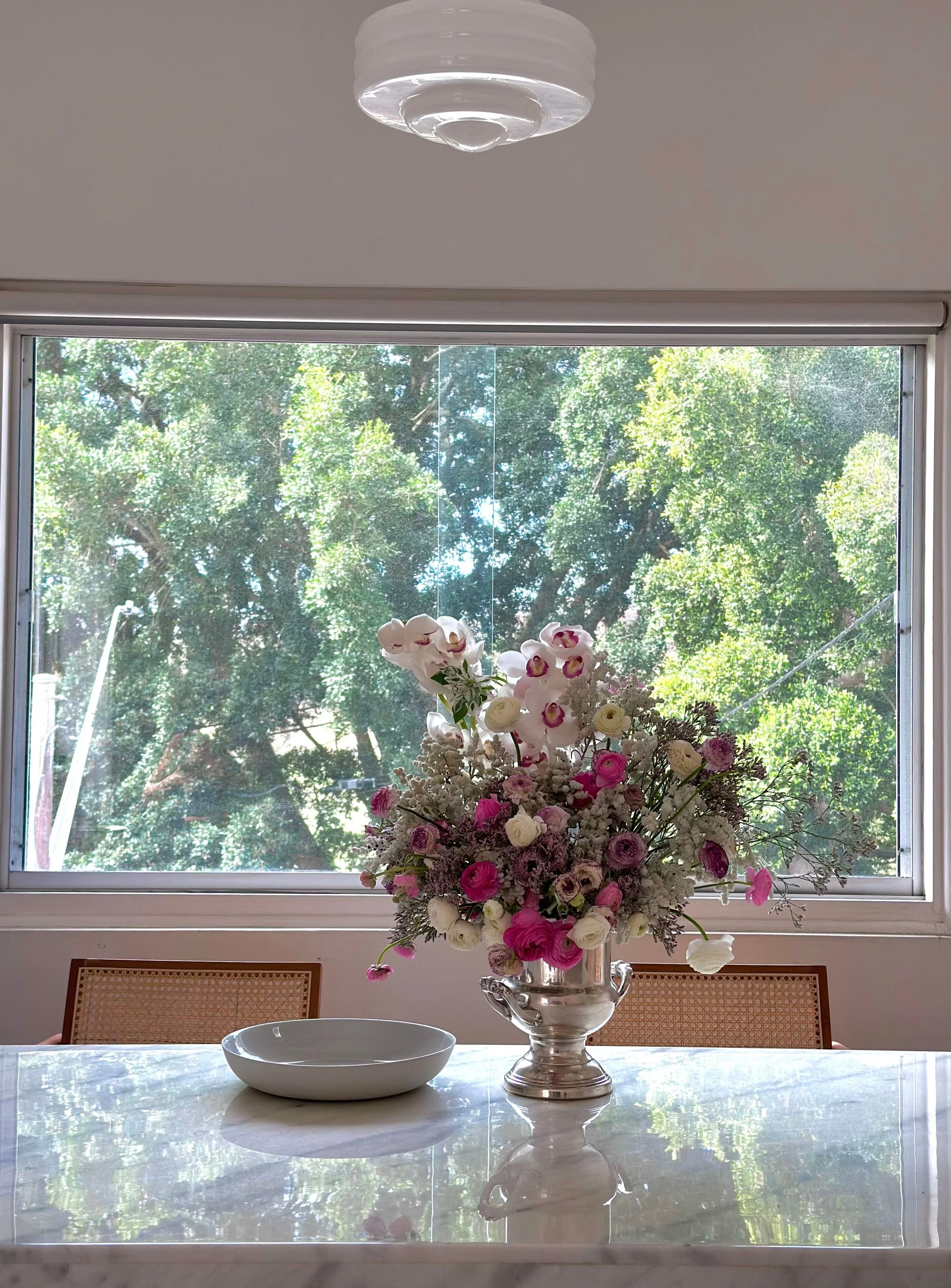 A large bouquet of white and pink flowers in a silver vase on a marble table in front of a window overlooking green trees.