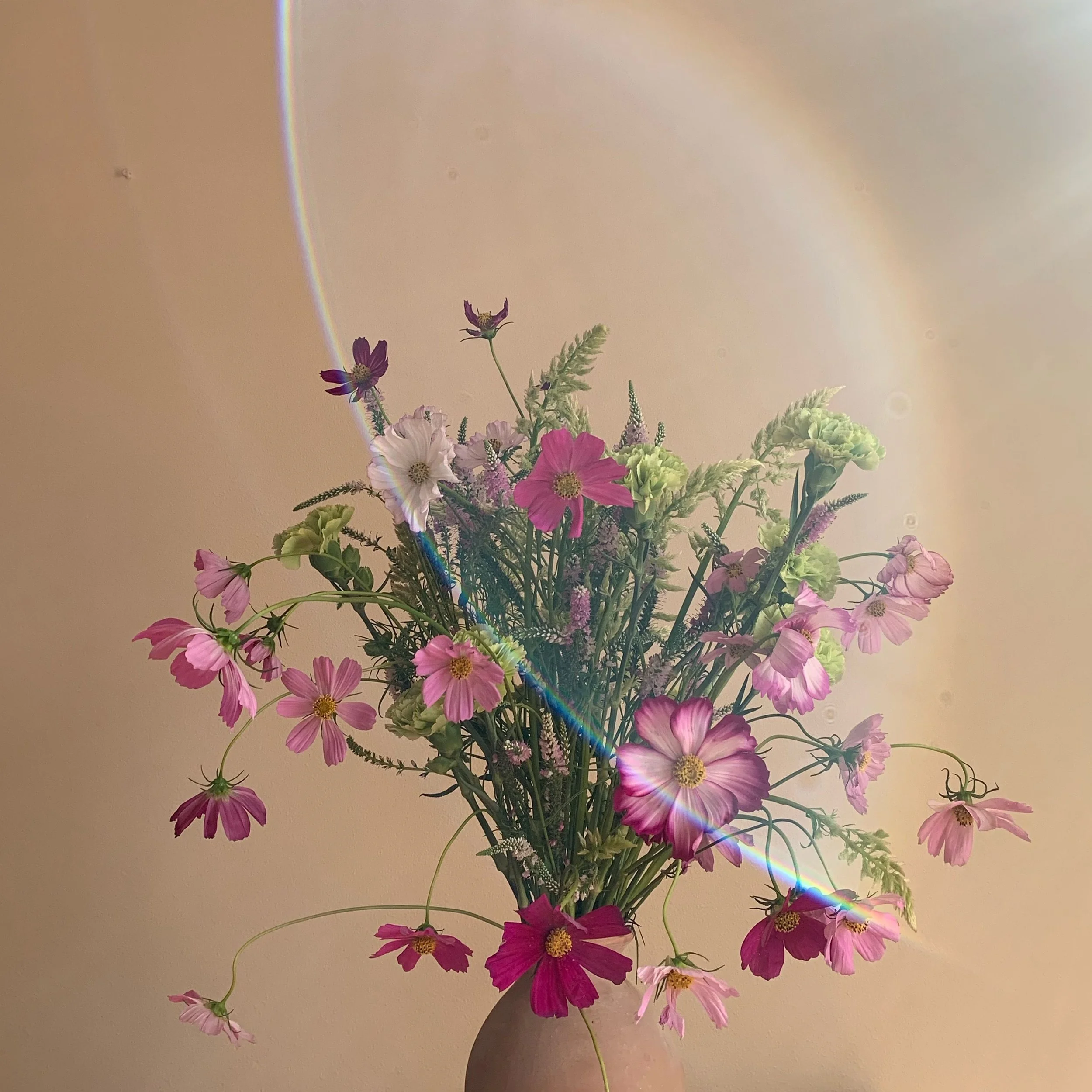 A ceramic vase holds pink and light purplish-pink cosmos flowers. Their petals are soft, delicate, and slightly ruffled, with yellow centers. The flowers are tall and airy, with thin stems that give them a light, floating look. Small sprigs of greene