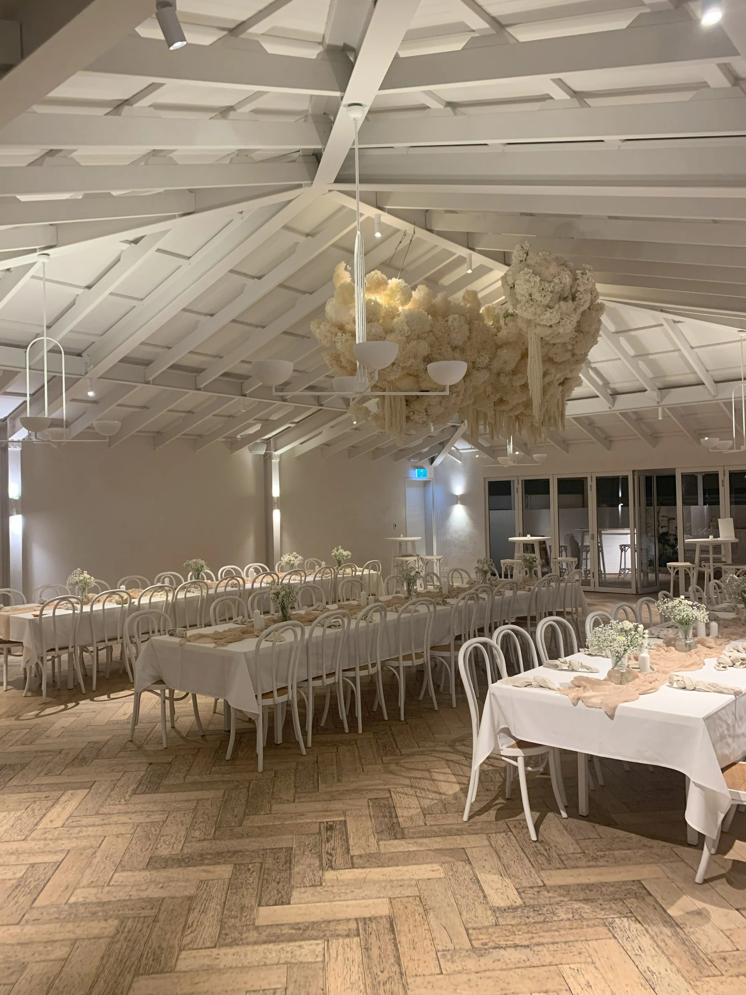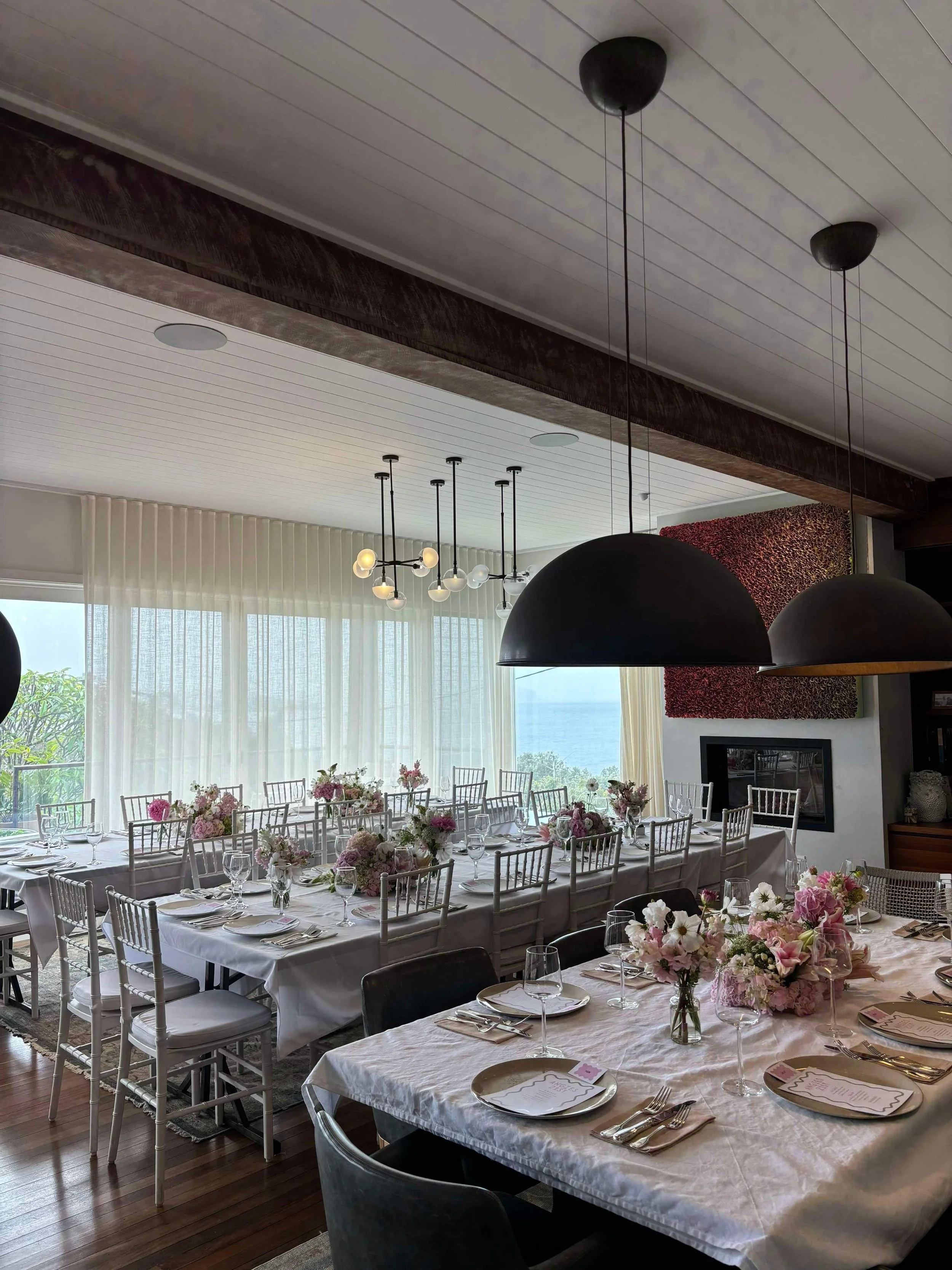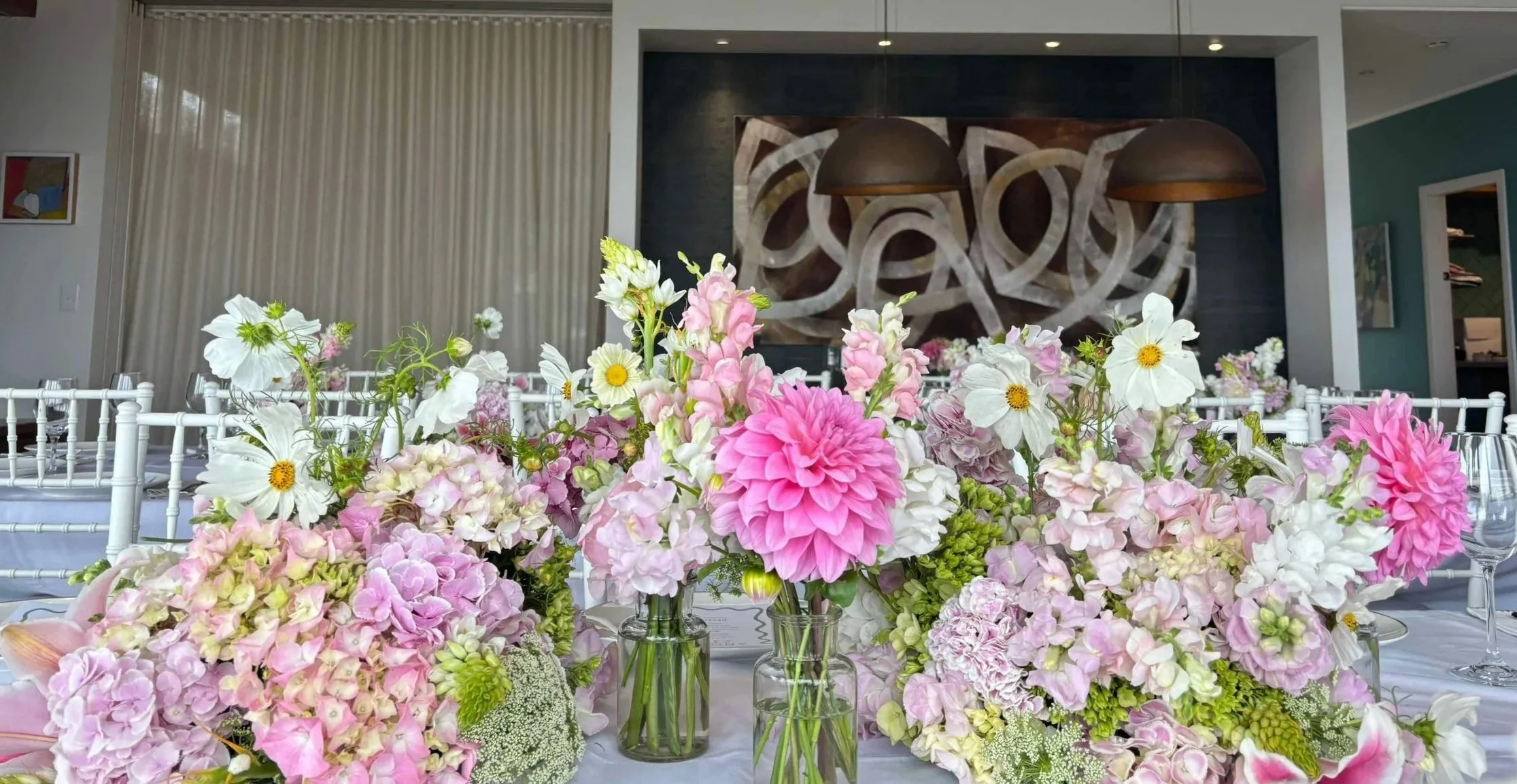Elegant room set for a celebration with long tables covered in white tablecloths, decorated with pink and white floral centerpieces, and surrounded by white and black chairs. Large black pendant lights hang from the ceiling. Floor-to-ceiling windows
