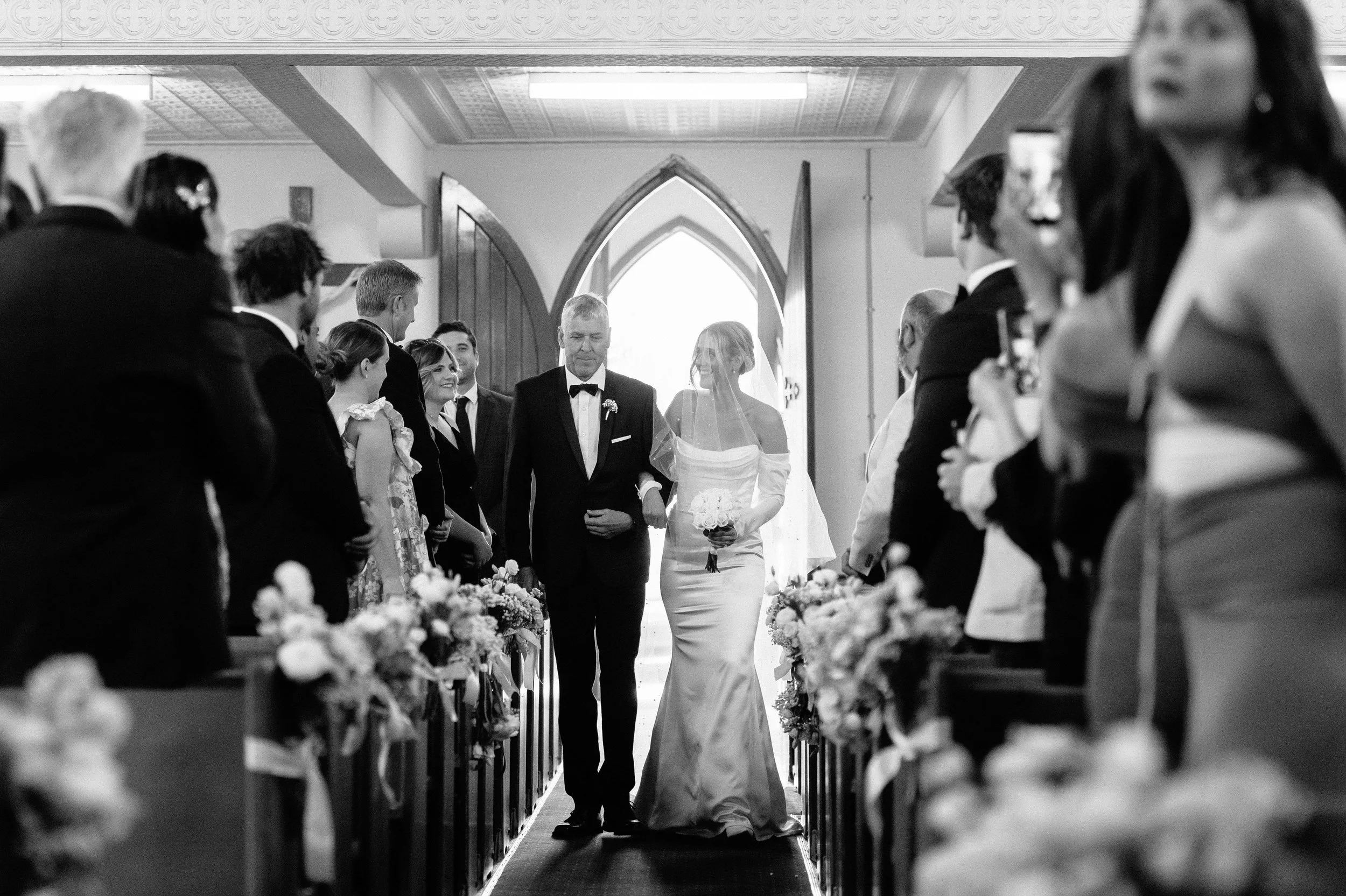 A bride walking down the aisle with her father at a wedding ceremony in a church, with guests on both sides watching.