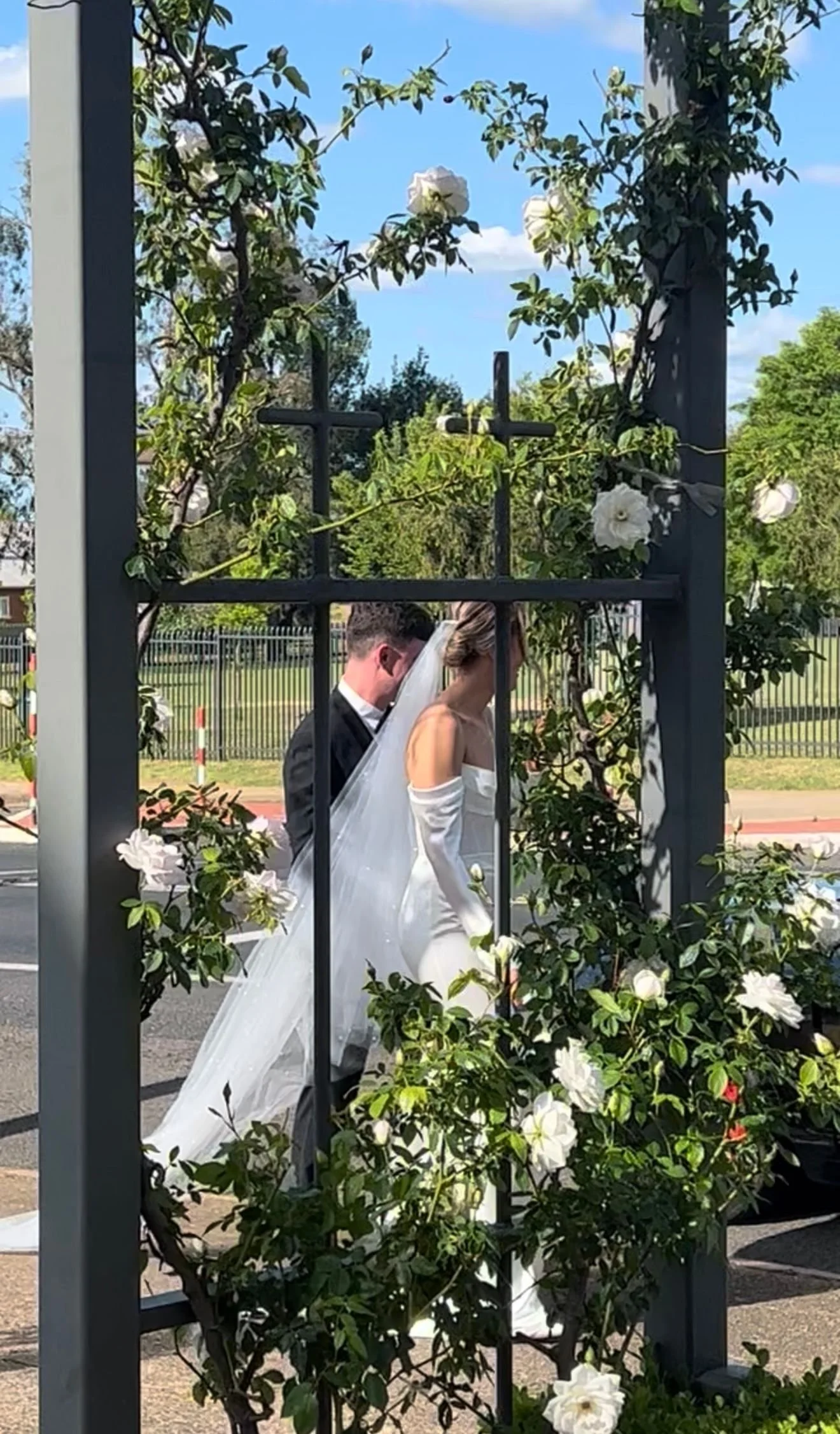 A bride and groom walking together on a sunny day, seen through a decorative metal archway partially covered with white flowering plants.