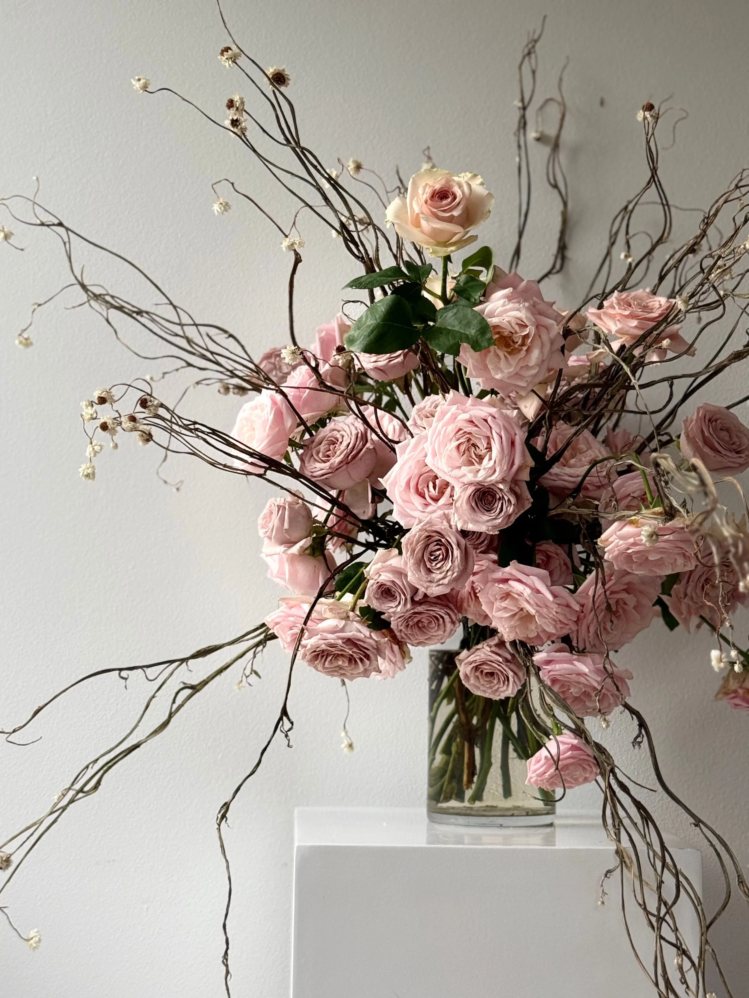A vase filled with romantic light pink roses. Their petals are full and velvety, in a deeper shade of pink that feels rich yet soft. The blooms are open and lush, giving the arrangement an ethereal, almost dreamy presence