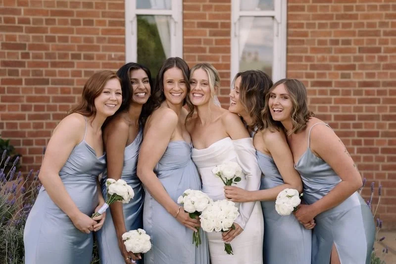 A bride and five bridesmaids standing outdoors in front of a brick wall, all smiling and holding white flower bouquets, dressed in light blue and white dresses.