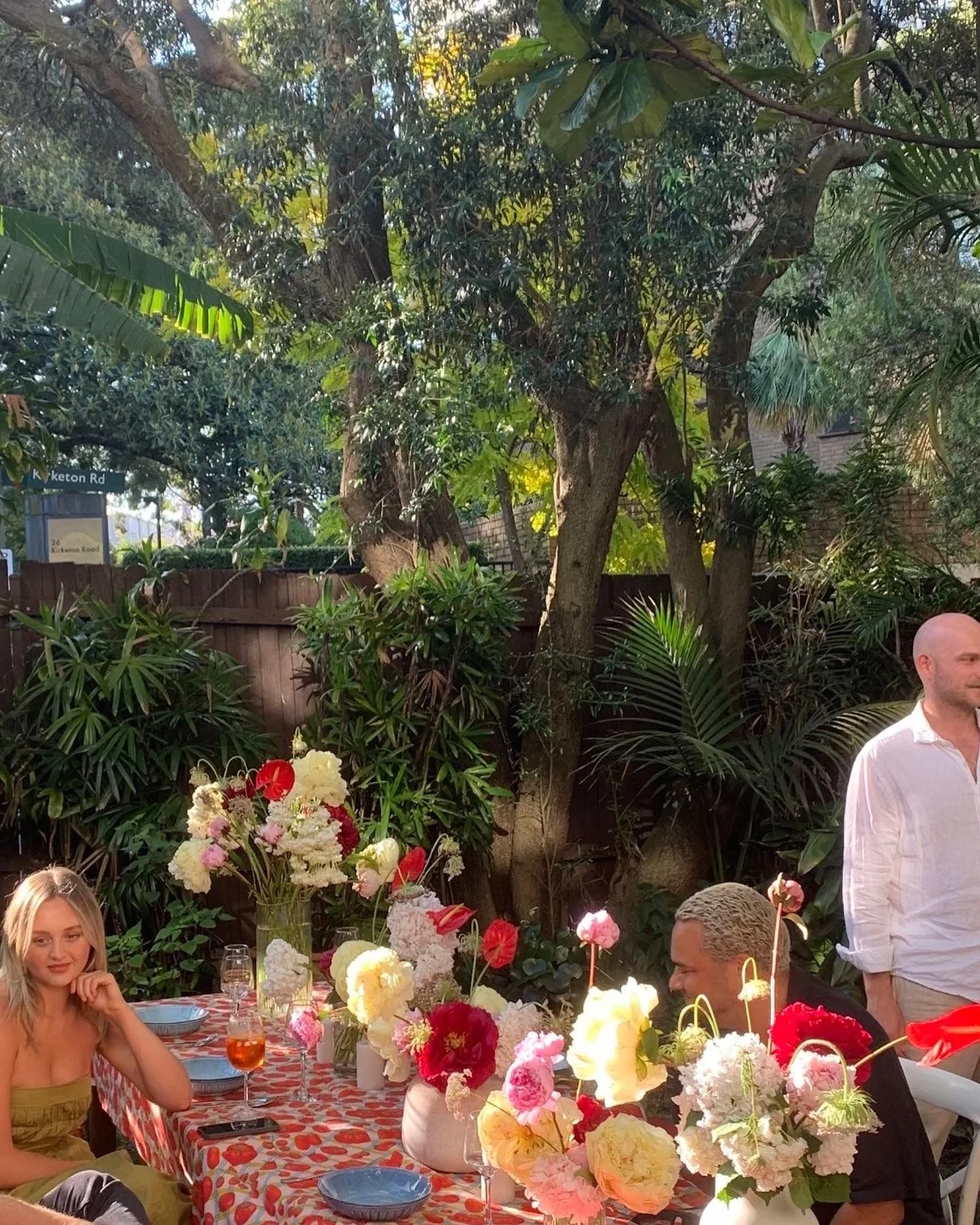 People enjoying a meal outdoors at a table decorated with colorful flowers, surrounded by lush green trees and plants