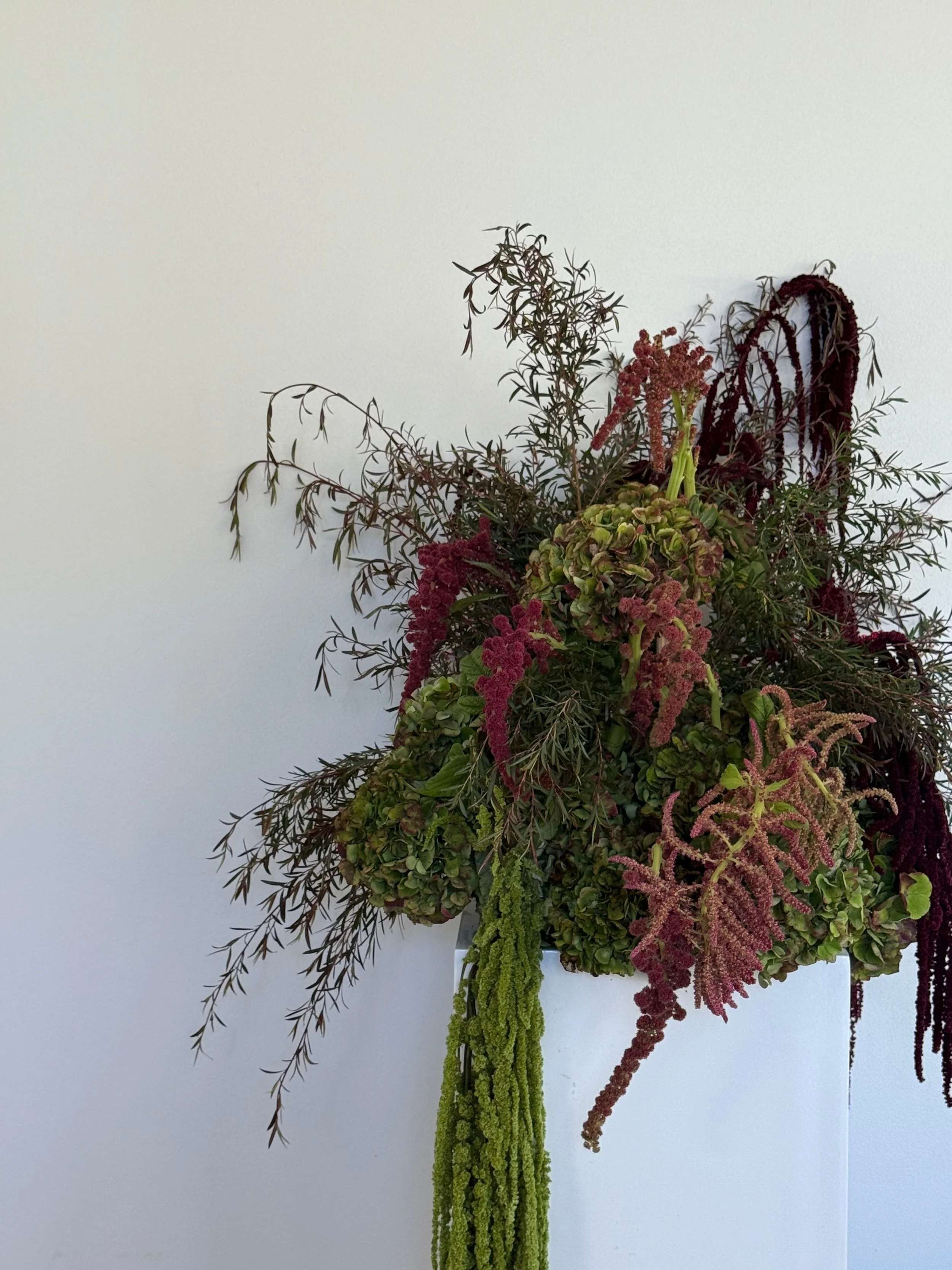 A floral arrangement in a white vase featuring various plants with green and burgundy tones, including hanging green amaranth, hydrangea, and long, slender stems with small leaves.