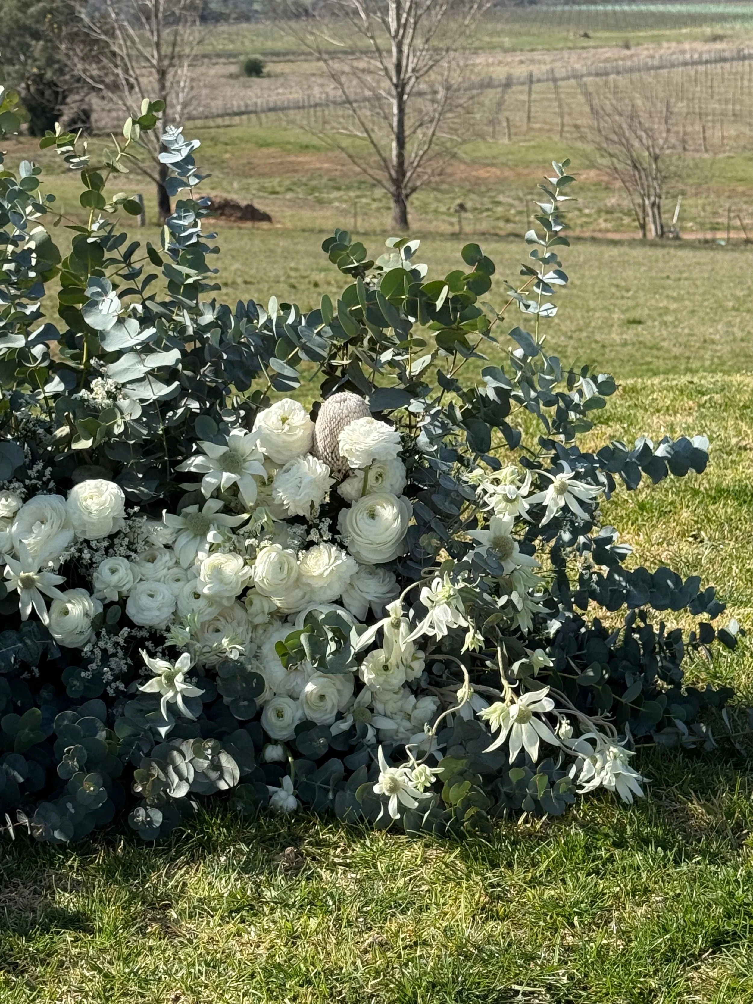 A flower arrangement with white flowers and green foliage on a grassy outdoor area with trees and a distant vineyard.