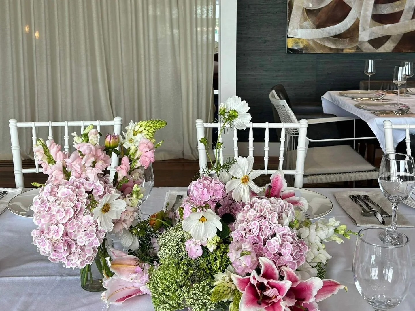 Elegant dining table with a large floral centerpiece featuring pink hydrangeas, white cosmos, pink lilies, and greenery. The table has white tablecloths, wine glasses, silverware, and plates set for a meal. White chairs and a dark background with art