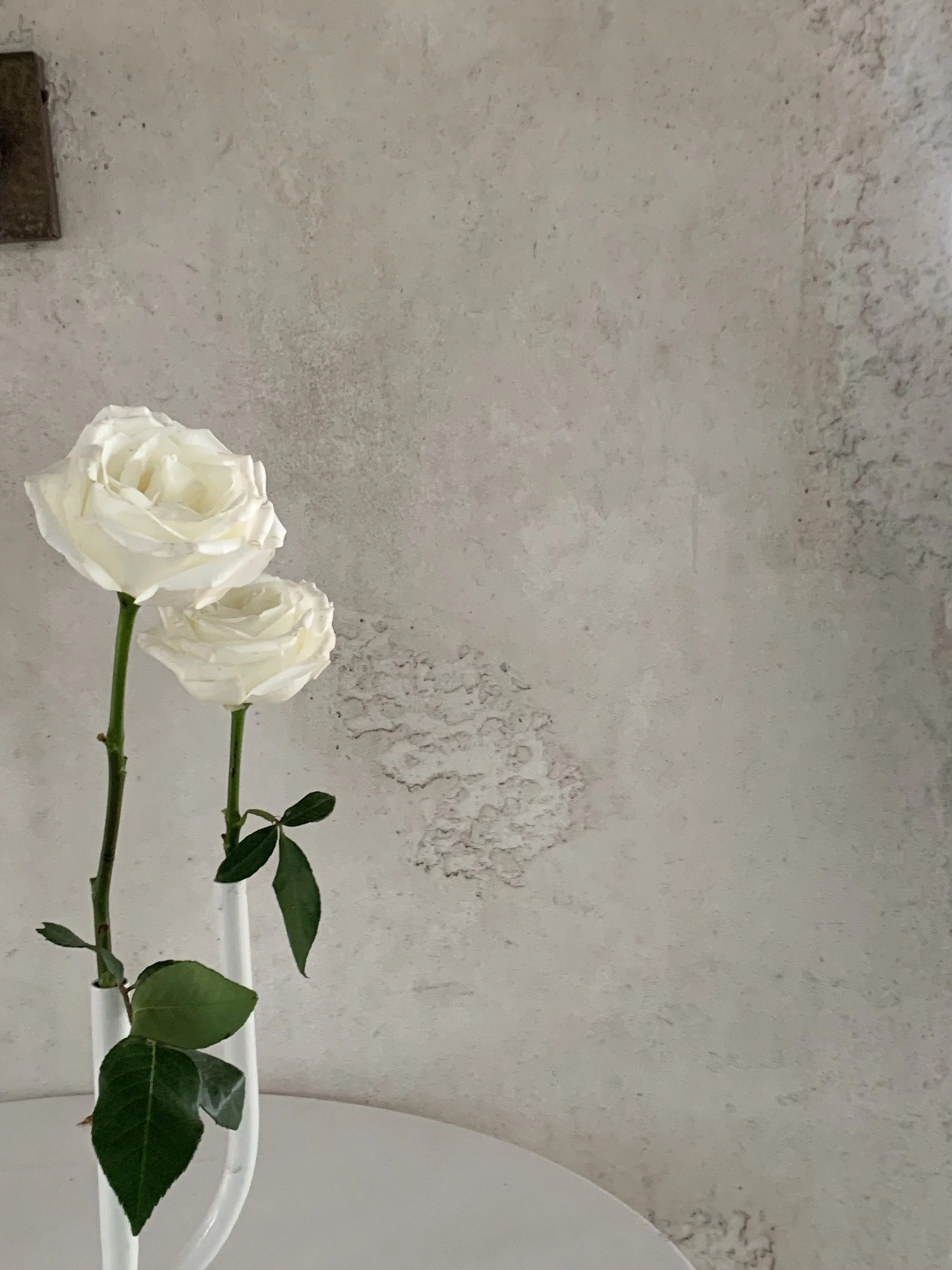A rough concrete wall serves as the backdrop. In front of it are two single-stem roses, standing alone. Their simple, elegant presence contrasts with the raw texture of the wall, creating a minimal and striking composition.