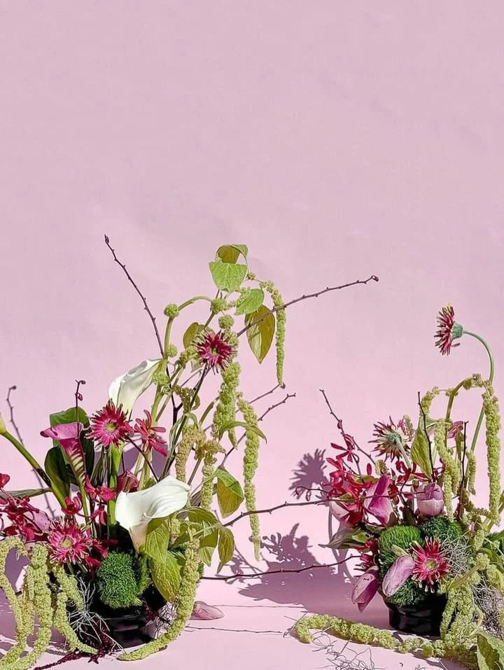 The backdrop is light pink. In front of it, two flower arrangements sit on the floor. The flowers are a mix of fresh green and deep pink. The green flowers are long and hang down loosely, while the pink flowers are tall stems that point upward and sp